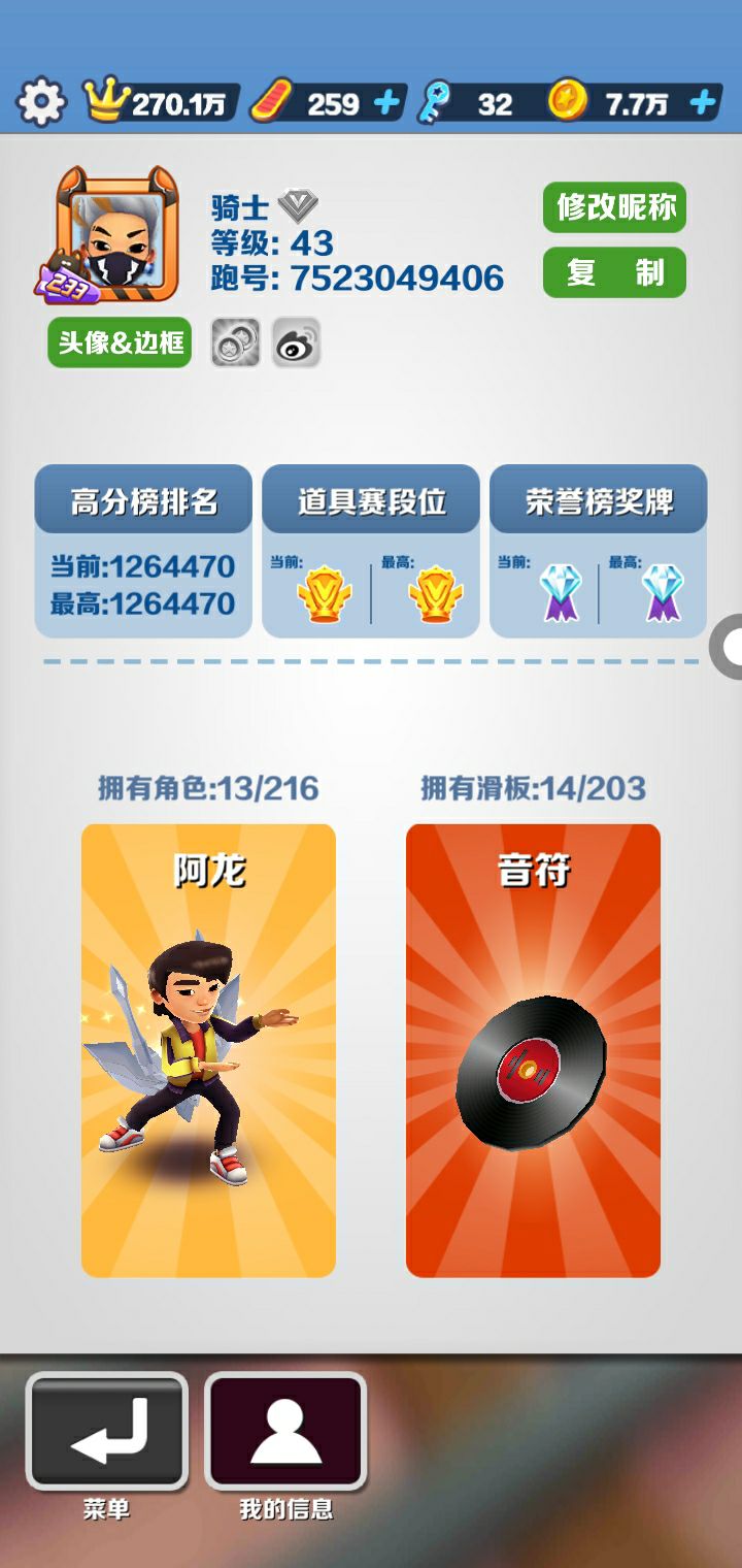 玩三周的地铁跑酷账号。