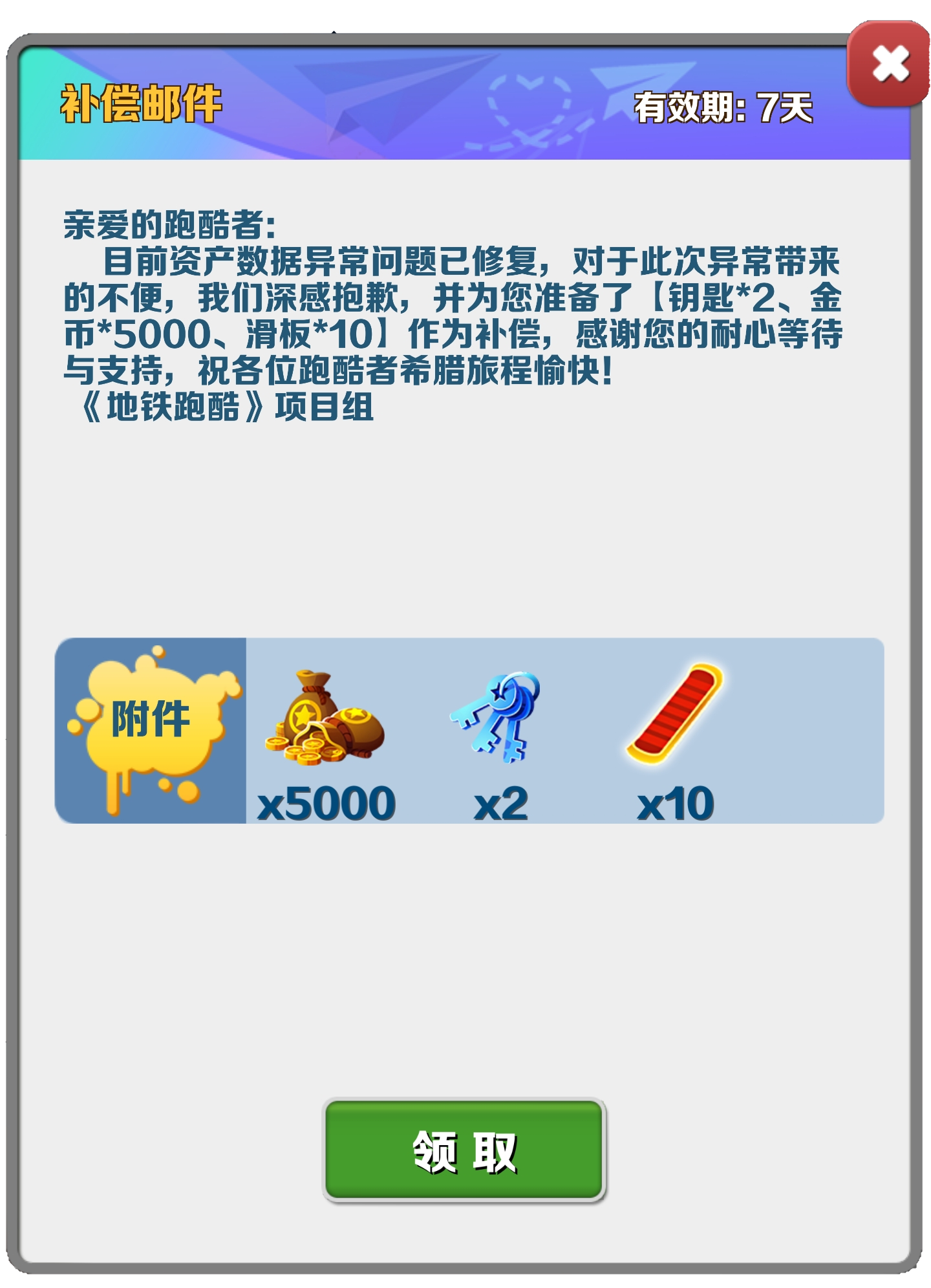 亲爱的跑酷者:目前资产数据异常问题已修复,对于此次异常带来的不便,我们深感抱歉,并为您准备了[钥匙*2、金币*5000、滑板*10] 作为补偿,感谢您的耐心等待与支持,祝各位跑酷者希腊旅程愉快!
