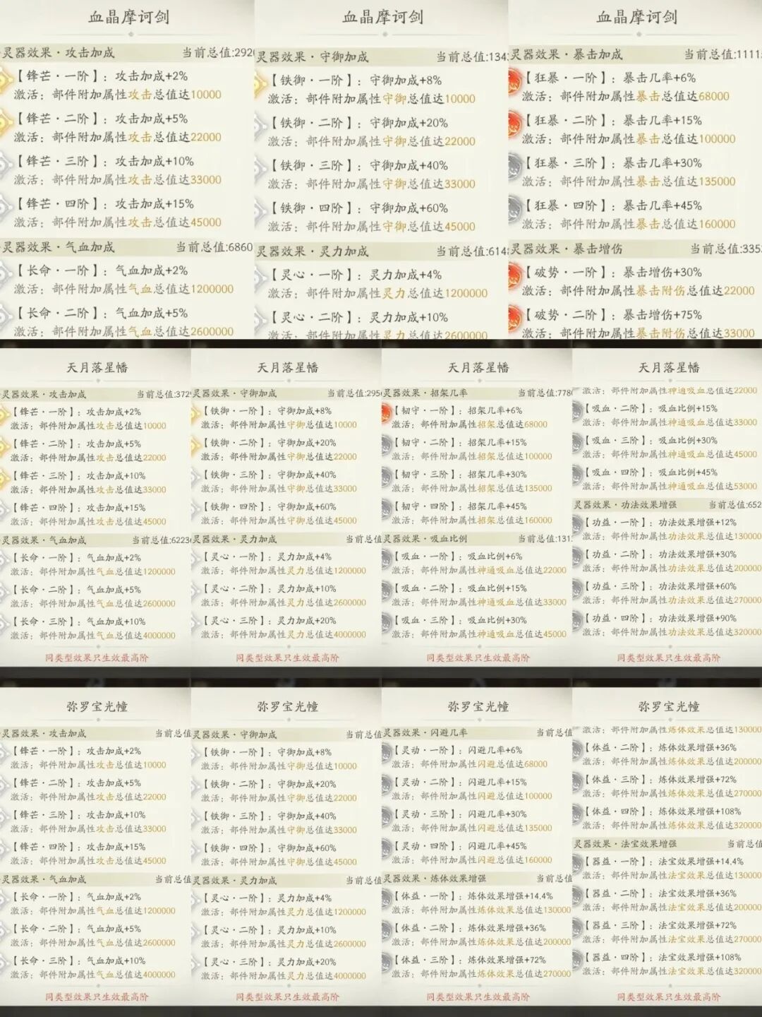 最后这几个灵器使用老王上述的洗灵技巧基本上最少都能2红属性,所以不管哪个灵器核心加成开到3阶就OK了,非核心的加成尽可能达到2阶噢。