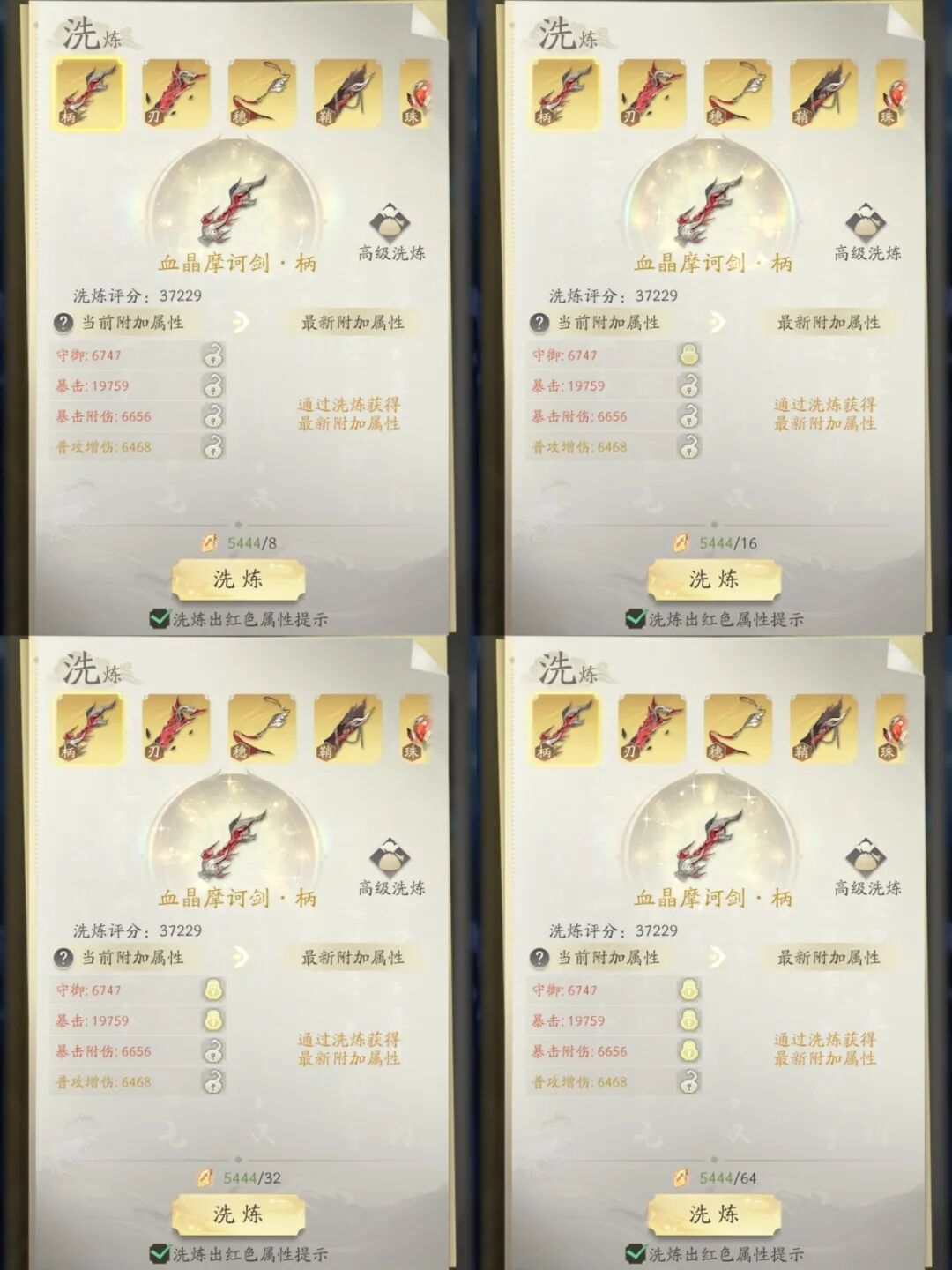 → 上品(蓝色)一次消耗2个洗灵奇石;每锁定一个属性洗灵奇石翻倍;