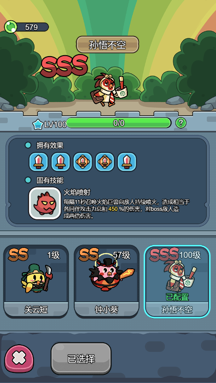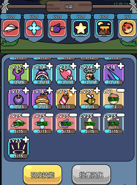 技能:可通过召唤、购买礼包,解锁或升级技能,通过一定的关卡可解锁技能栏,最高可配备6个技能。每个技能除可对怪物造成伤害外,还可提升主角攻击力。