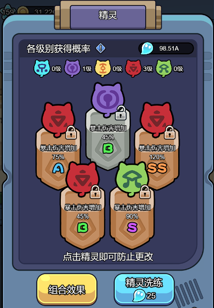 精灵:通关普通9-9,解锁精灵玩法。消耗海洋精灵可获得不同颜色、不同属性的精灵,组合搭配可产生不同的属性加成。