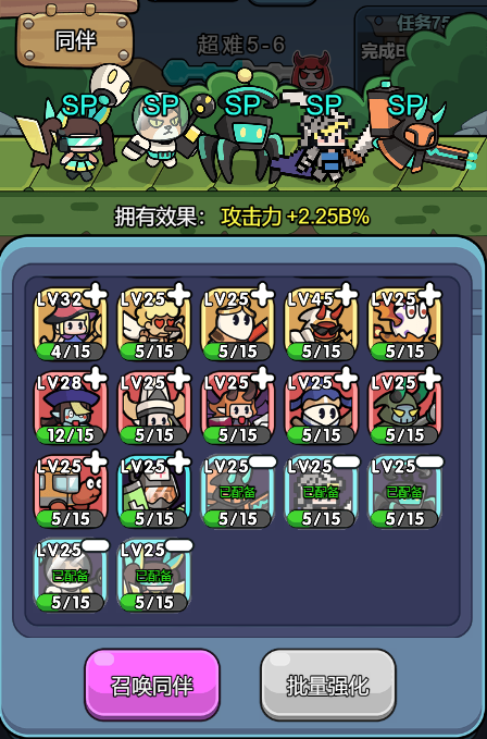 可通过召唤、购买礼包,解锁或升级同伴,通过一定的关卡可解锁同伴栏,最高可配备6个同伴。每个同伴除可对怪物造成伤害外,还可提升主角攻击力。