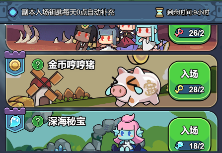 目前共有Boss狂欢、金币哼哼猪、深海秘宝三个副本,需要消耗对应的钥匙开启副本,每个副本钥匙存储上限为2,每日0点自动补充钥匙数量至上限,每日可通过观看广告、购买礼包、幸运转盘额外获得钥匙。