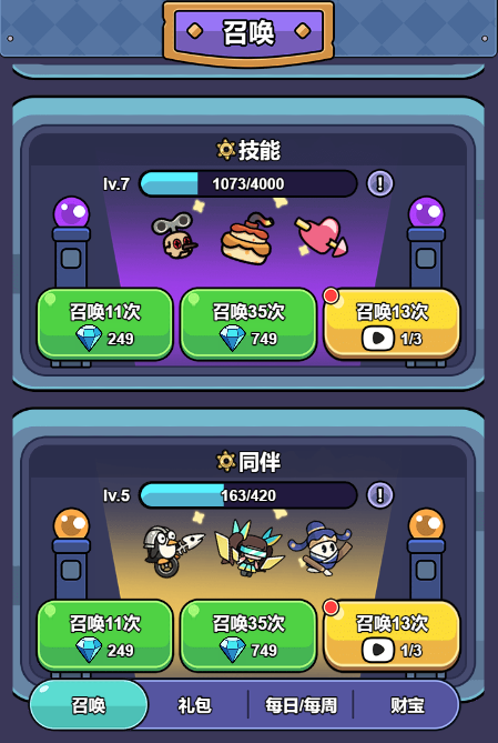 在商店中,你可以进行召唤,获得装备、同伴和技能,观看广告可额外获得次数;还可购买各种超值礼包,ss、sss级装备、同伴和技能可帮助你快速通关。若通关失败了,不妨来商店看看~