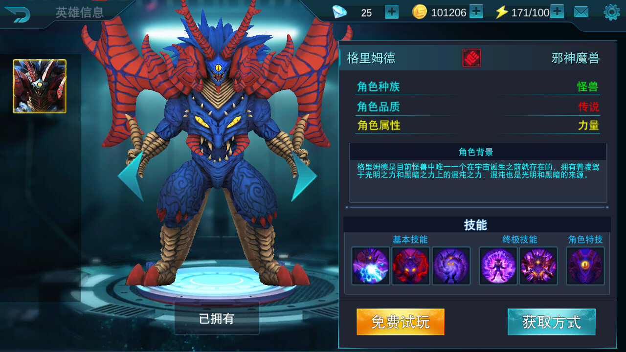 解放体内的混沌力量,展开黑暗领域,巨大化为邪神状态,造成诅咒效果和大量伤害,并解锁一套全新的技能,以巨大化格里姆德释放出更具破坏力的光线技能,