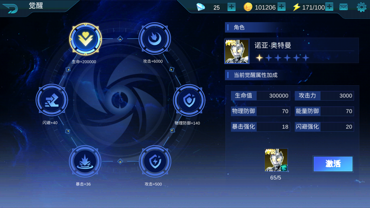 全新系统,当角色的基础形态达到6星时解锁该功能,消耗角色碎片提升属性,每解锁6个属性,即可消耗觉醒进阶石进行进阶,提高星级。