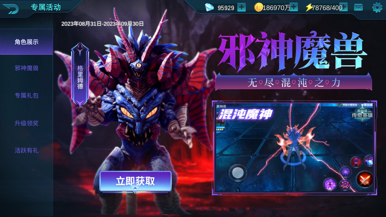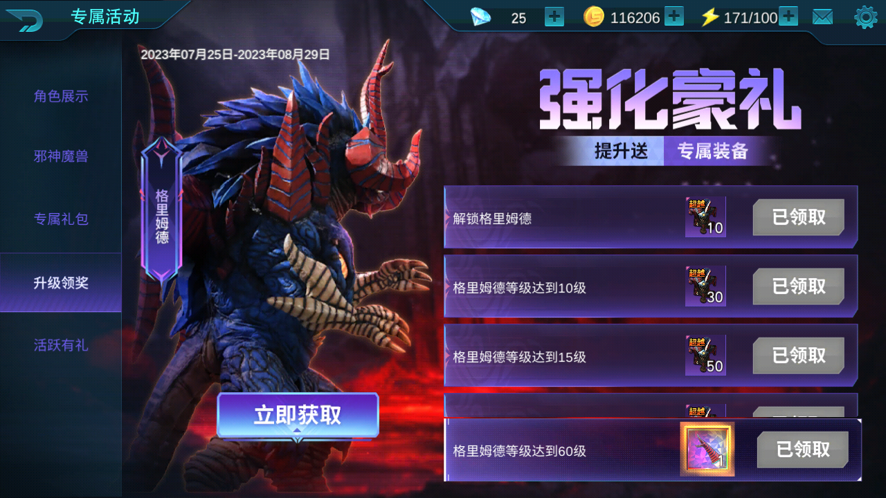 游戏主界面新增格里姆德专属活动,邪神专属装备、专属变身器限时获取,使用格里姆德完成指定任务更可获得格里姆德专属饰品