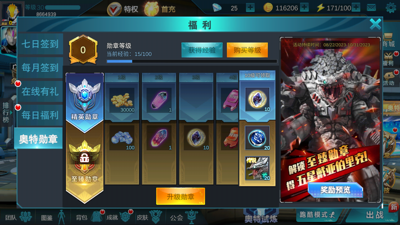 4、新增奥特勋章重置功能:当玩家解锁至臻勋章完成全部任务,领取完全部奖励后,点击新增重置按钮可提前结束当前一期的奥特勋章,加速角色获取