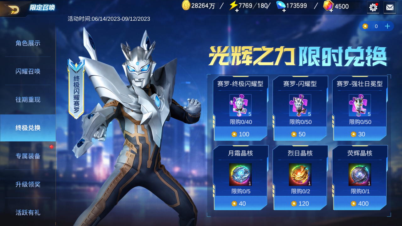 通过抽奖获取【等离子光辉】,消耗等离子光辉兑换赛罗-终极闪耀形态碎片、赛罗-闪耀形态碎片、赛罗-强化日冕形态碎片