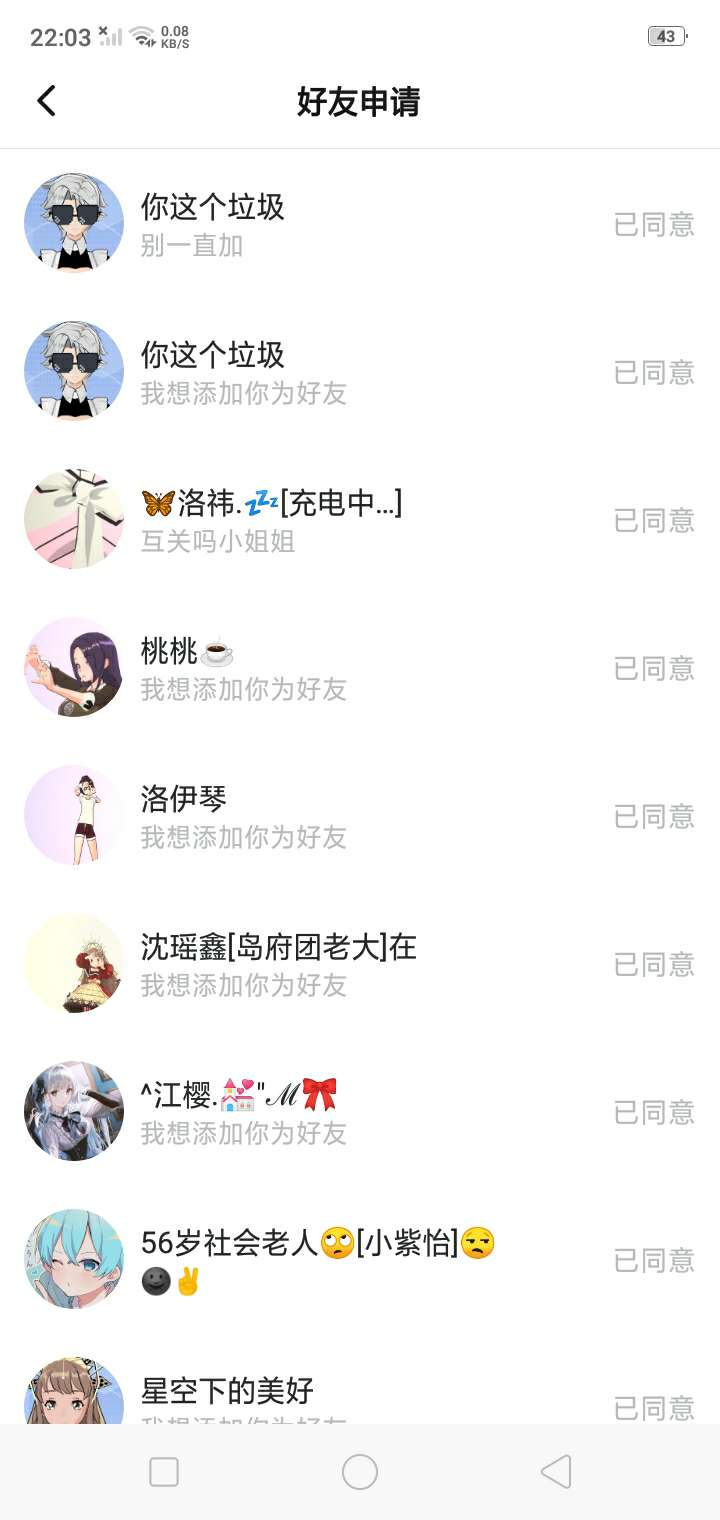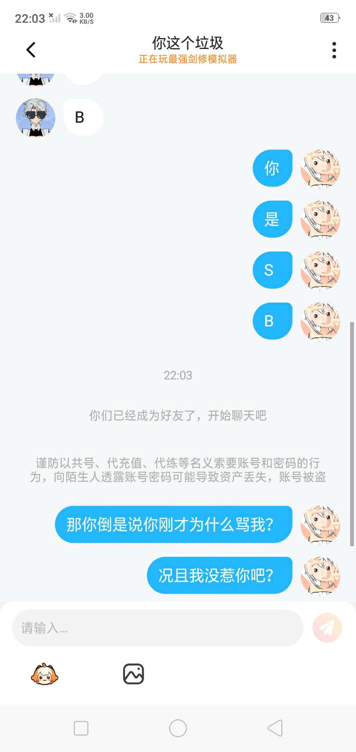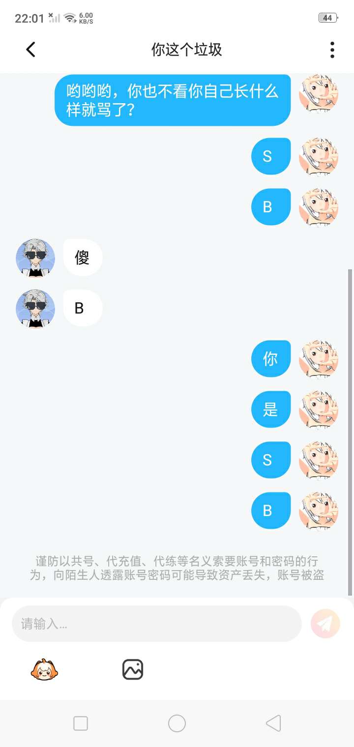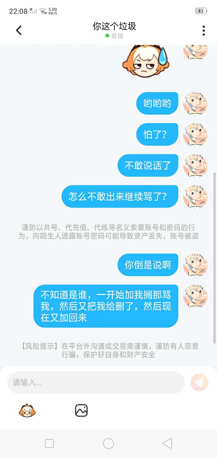 我~真~的~很~怕~呢~你一开始加我,我还以为什么事情,然后我就问你说加我好友有什么事吗?你就回,没事你个垃圾,然后接下来放图片。我还想说不是大哥我认识你吗?你就骂我,就算你是听完老子也不至于随意骂人吧,况且你想骂哪一个人就骂哪一个人,你谁啊?😒😒😒😒😒