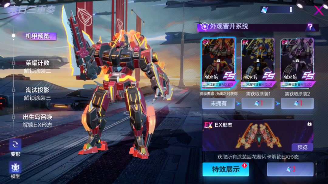 3.出生岛召唤特权:SS级外观解锁EX形态后,选手可在胜者为王赛的倒计时准备阶段召唤该外观机甲。