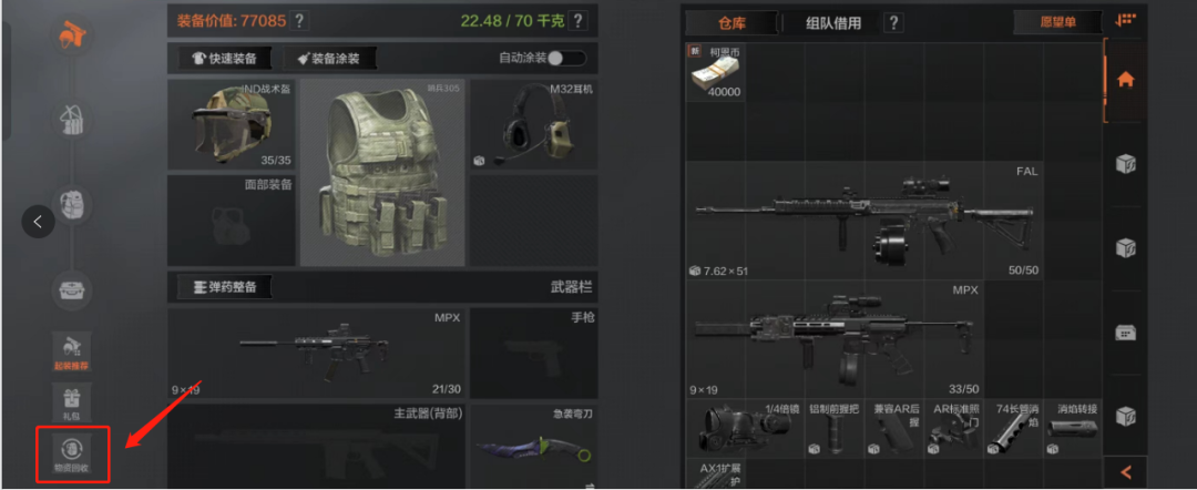 此处提醒大家,回收空间的物资支持物品取出、物品查看、物品出售联络人,但不支持移动物品位置、从背包中取出物品、取下配件或子弹,如需使用装备,记得及时整理回收空间!