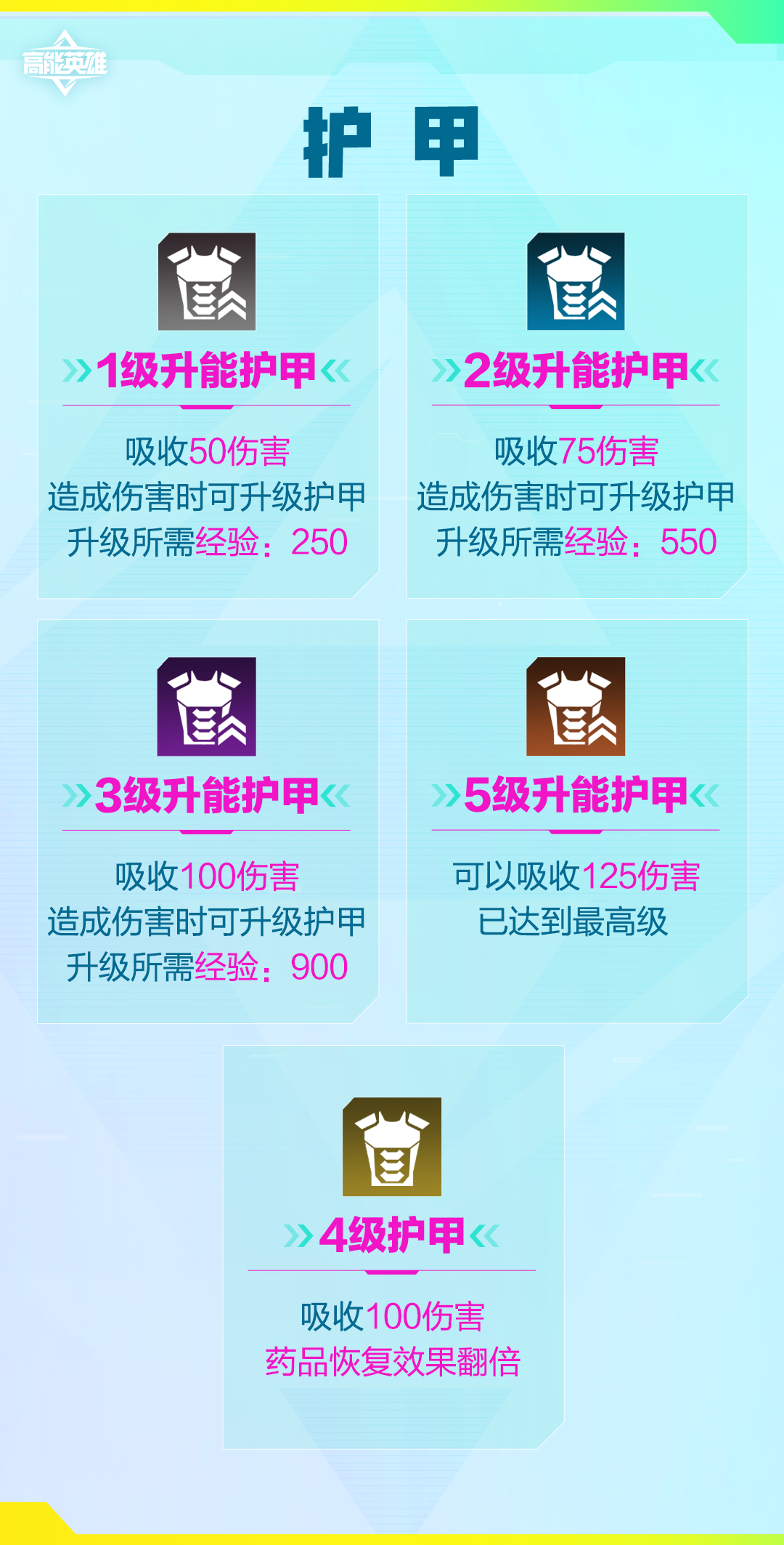 升能护甲可通过「造成伤害」以及「使用护甲升能器」获取经验不断升级,最高可升级为5级升能护甲。
