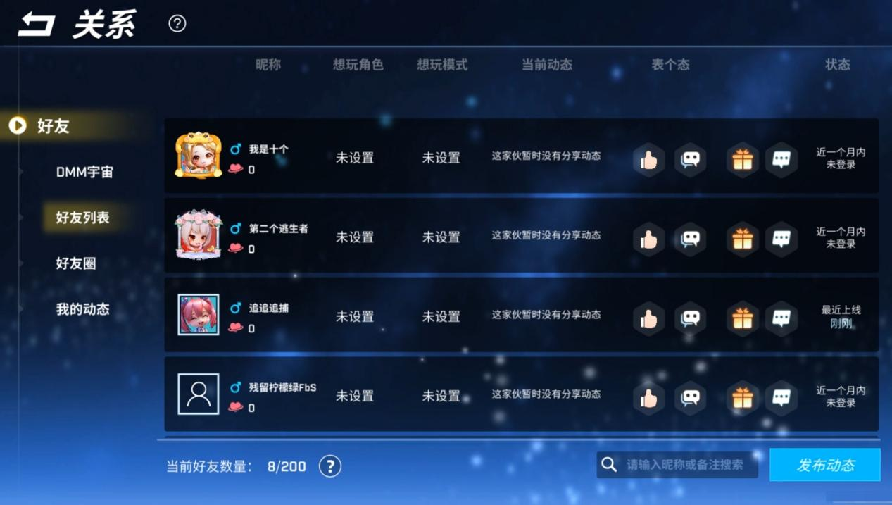 在亲密度系统的好友列表中,少年们可以看到和好友的亲密度,好友想要的角色和模式以及好友最新发布的最新动态噢!