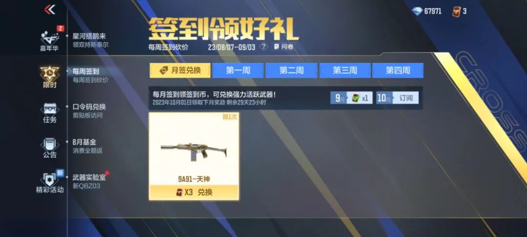 9A91-天神是七月到九月的月签到武器,在不知不觉的月签到中,想必不少玩家是直接白嫖的这一款武器。新的月签武器CZS2-血月将在10月加入月签到兑换中。