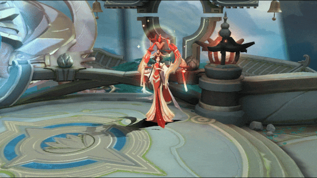 洛神向一名敌人抛出法球,法球在敌人间不断弹射,能量在敌人身上炸裂的瞬间百鸟纷鸣,对敌人造成魔法伤害并施加减速效果。