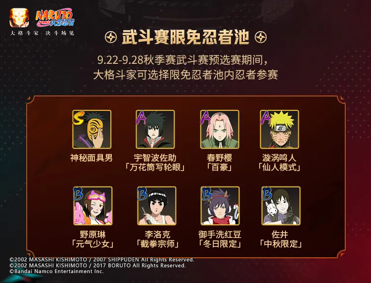 本次武斗赛也提供了多位限免忍者供学员们体验!在武斗赛预选赛期间,学员们可以选择限免忍者池内忍者参赛。限免忍者池内不仅有神秘面具男、鹰佐,还有功夫联动限定忍者截拳李等忍者,其中有没有学员们喜欢的忍者呢?