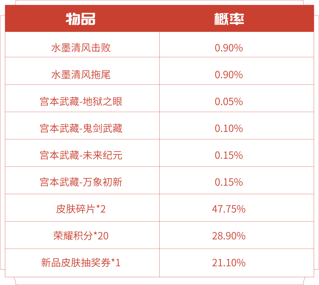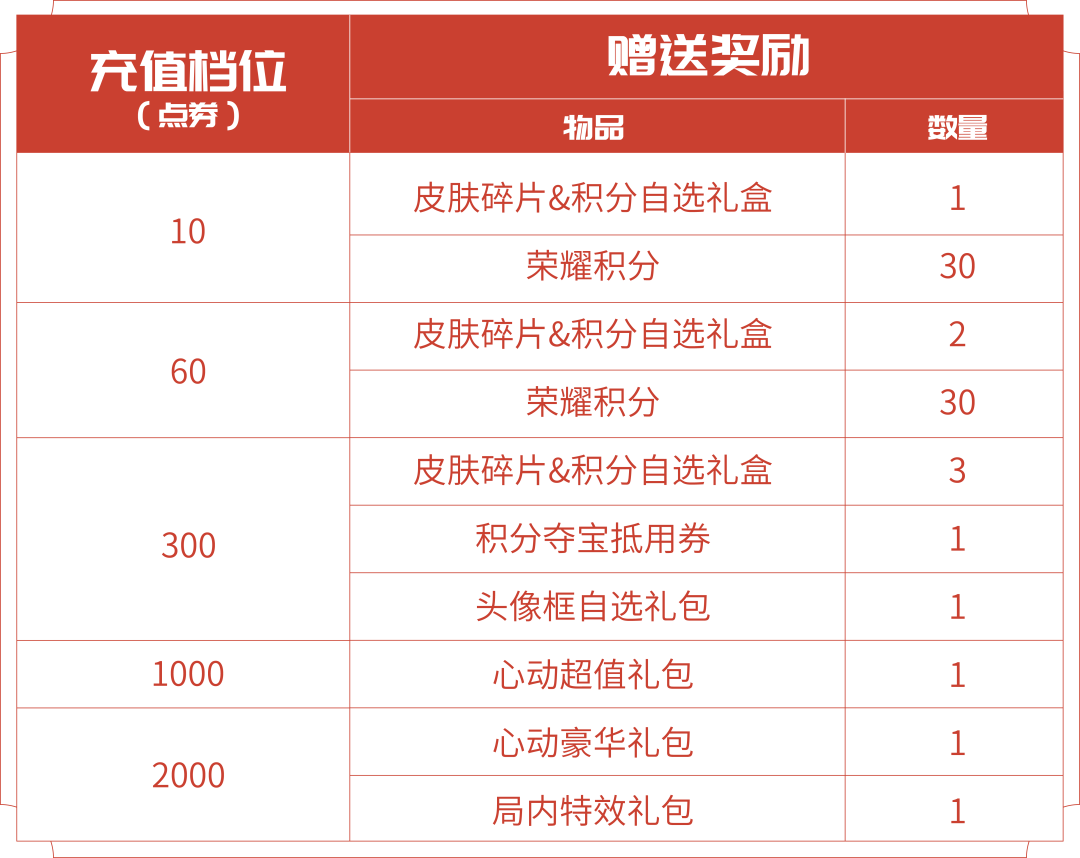 ●皮肤碎片&积分自选礼盒:打开礼包可任意选择以下奖励之一:荣耀积分*10或皮肤碎片*1
