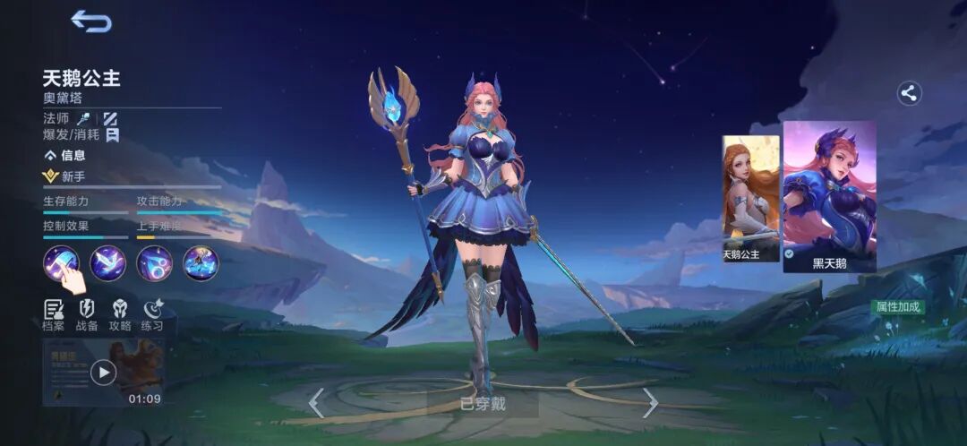 奥黛塔的1技能向指定方向释放一只天鹅,造成伤害并减速敌人;