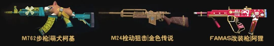 2、10月5日—10月11日,活跃可兑换M762步枪|萌犬柯基、M24栓动狙击|金色传说、FAMAS改装枪|阿狸等