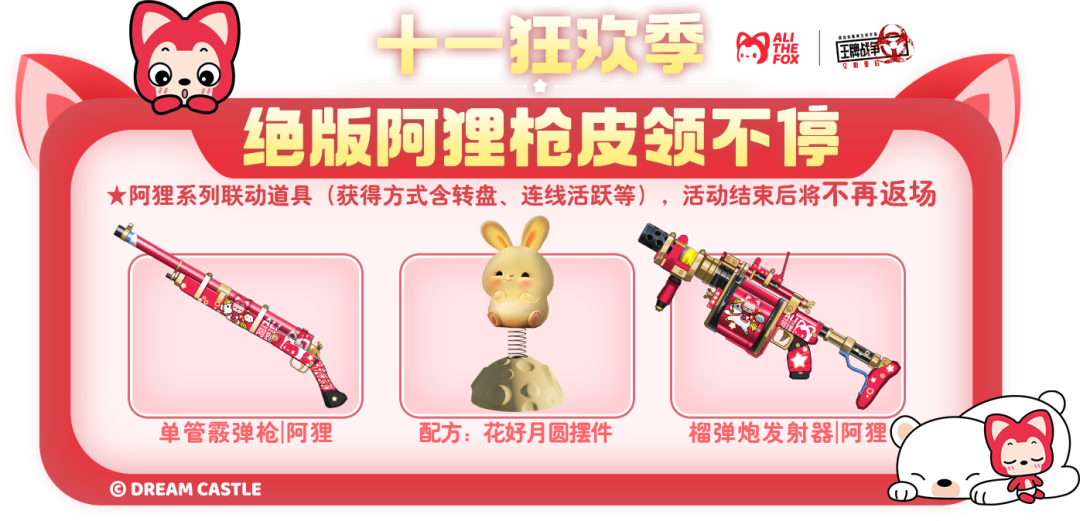 1、每日完成任务获得奖券,可免费抽取阿狸联动绝版枪械!双管霰弹枪|阿狸【绝版】、猛兽火箭筒|阿狸【绝版】、双持UZI冲锋枪|阿狸【绝版】、M4步枪|阿狸【绝版】、阿狸道具自选包(阿狸头套、FAMAS改装枪|阿狸、大厅背景|阿狸、银色战魂钥匙*2)等;