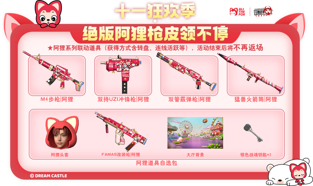 同时,还能获得银色战魂钥匙、梦幻阿狸钥匙、胶囊币、神秘枪械钥匙等免费抽取皮肤!