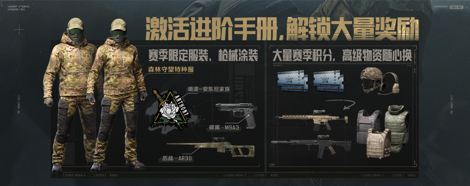 全新赛季进阶手册上线,激活进阶手册解锁赛季限定服装、枪械喷漆,大量赛季积分,高级物资随心换!