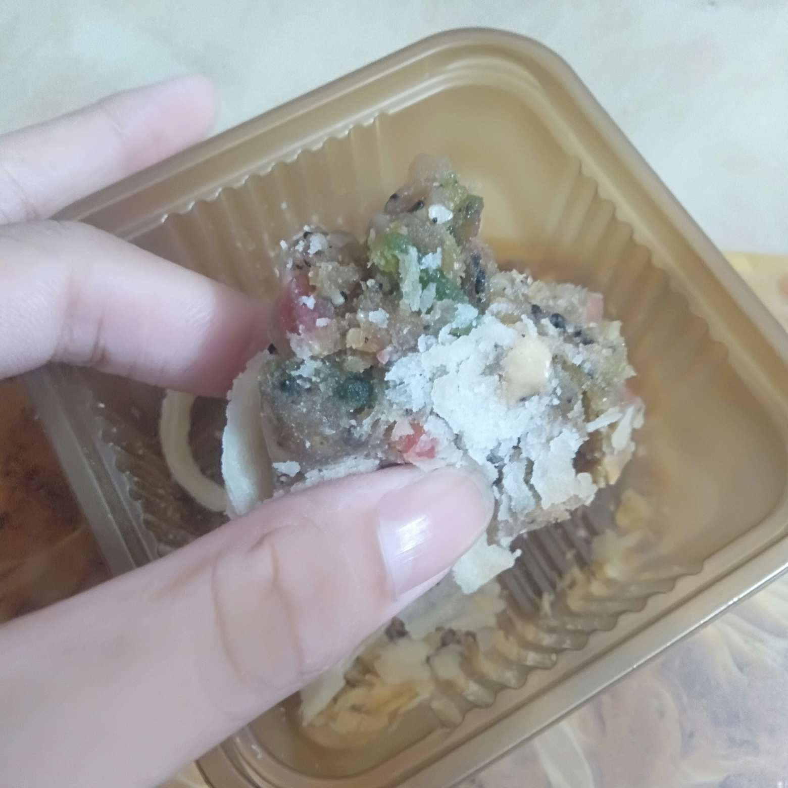我靠,吃月饼吃到这玩意。这红色,绿色的你们说这是什么? 红色的是玫瑰,无语了。 绿色的是橘子的叶子。