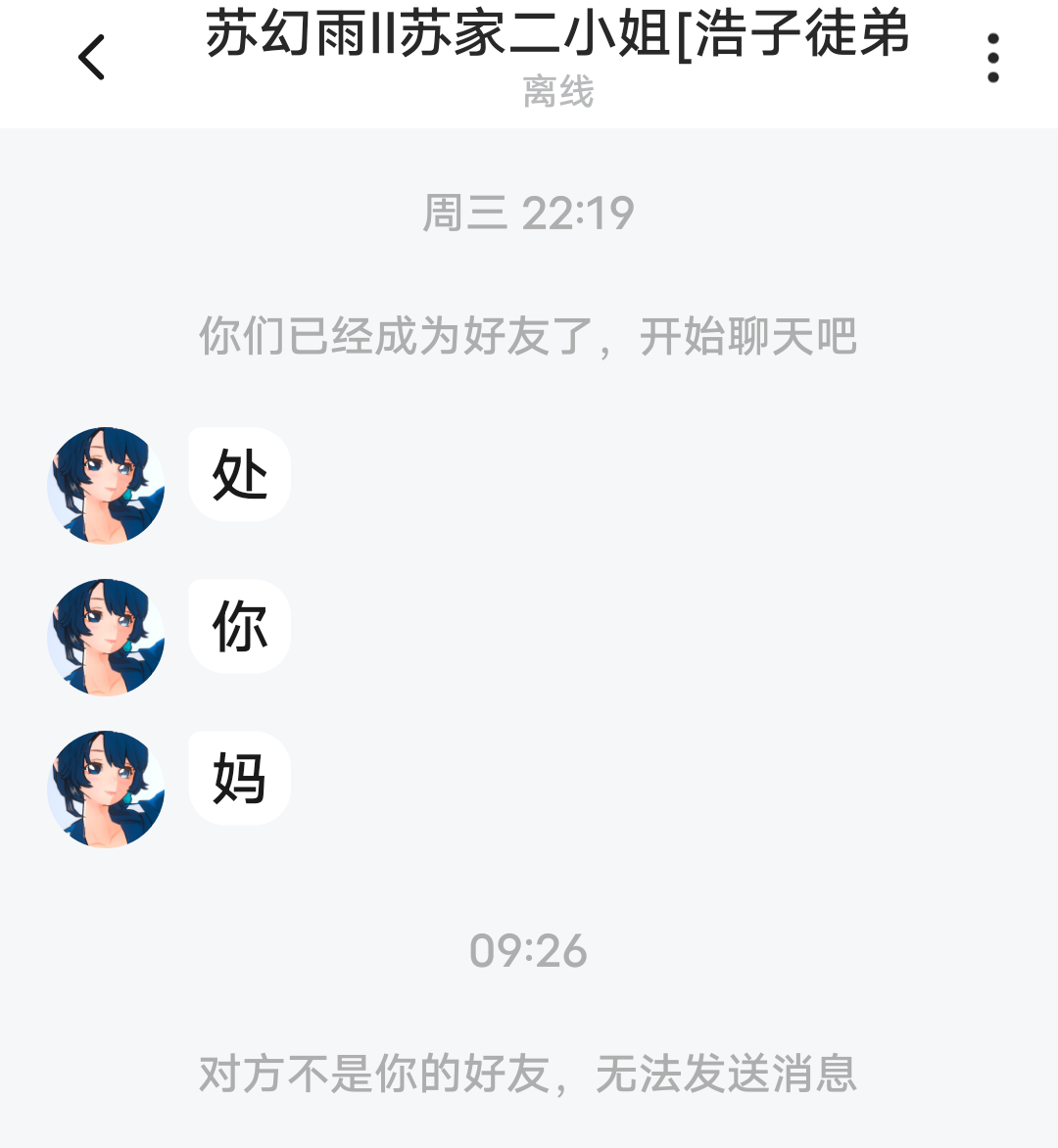 刚开始我不是发了个处女CP的申请吗 她看到了后就直接上来骂我 骂完之后就把我拉黑了 真的很无语=_=