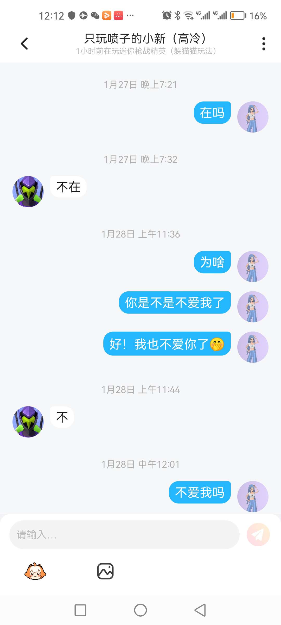 我昨天说我男友你还爱我吗,他也没回到了今天早上他上线了我问他在不在也没回我!他是不是不爱我了😭💔