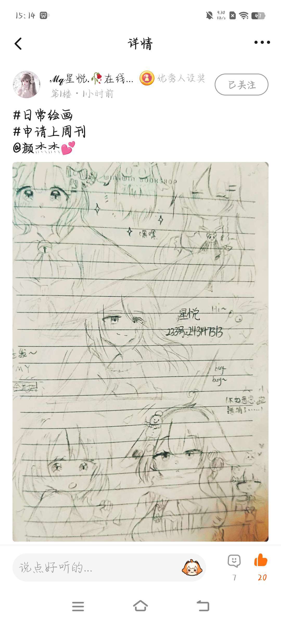 注:注意看这个画非常的好看😍,仿佛被天使吻过的手🦋,眼睛,头发也达到了极致的高度💤,真的是一位绘画小能手唉💐