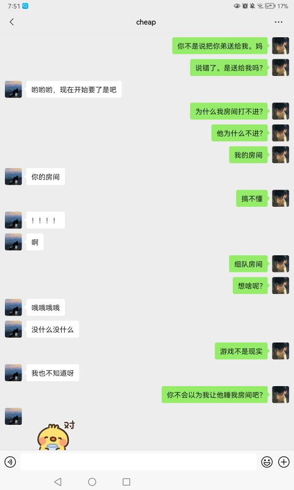 又是一个离谱我说让他弟进我房间,他以为是那个他误会了,我的意思是进游戏的房间。
