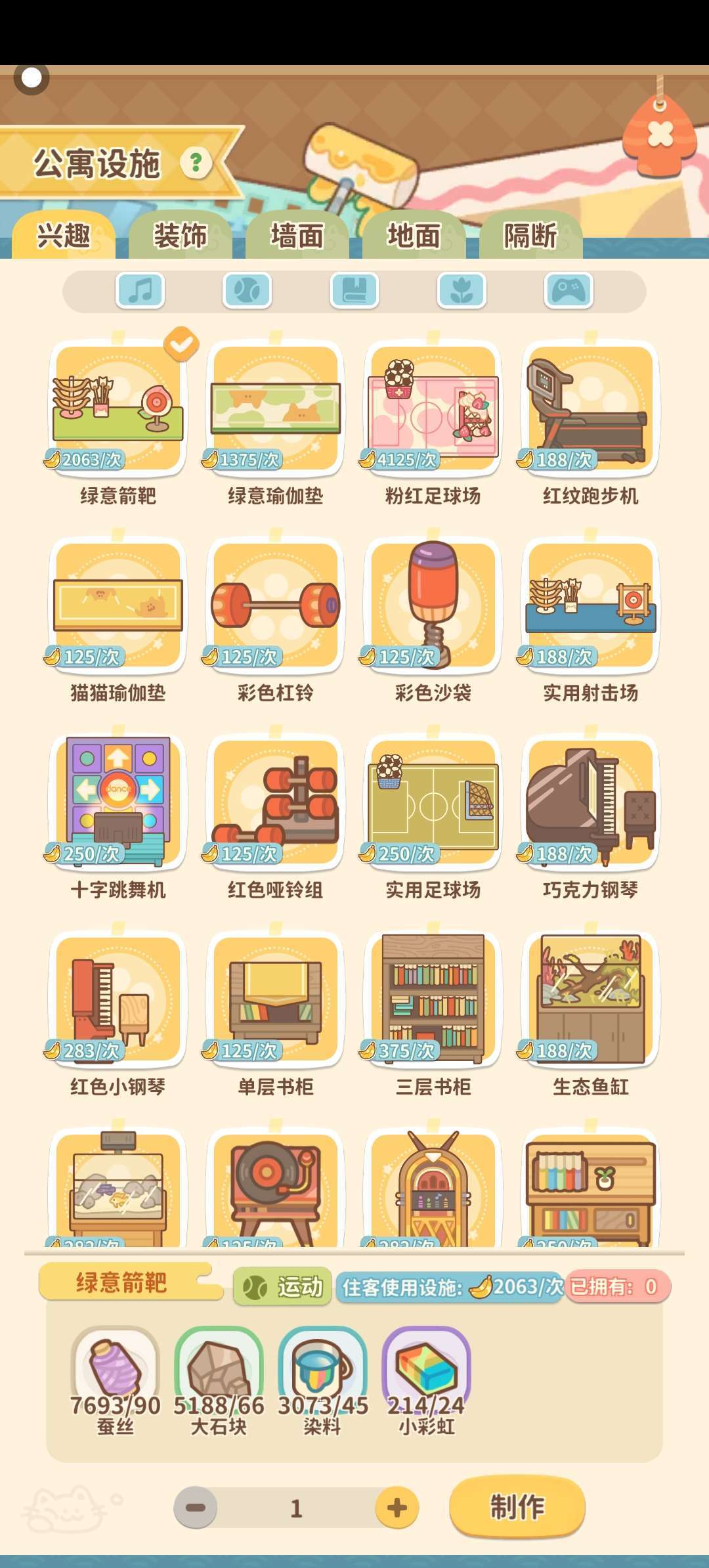首先是兴趣类设施,不建议多放最好只要放一个就行,因为兴趣类设施产生金香蕉的方式是住客使用之后,便会产生一次使用后的金香蕉数量。