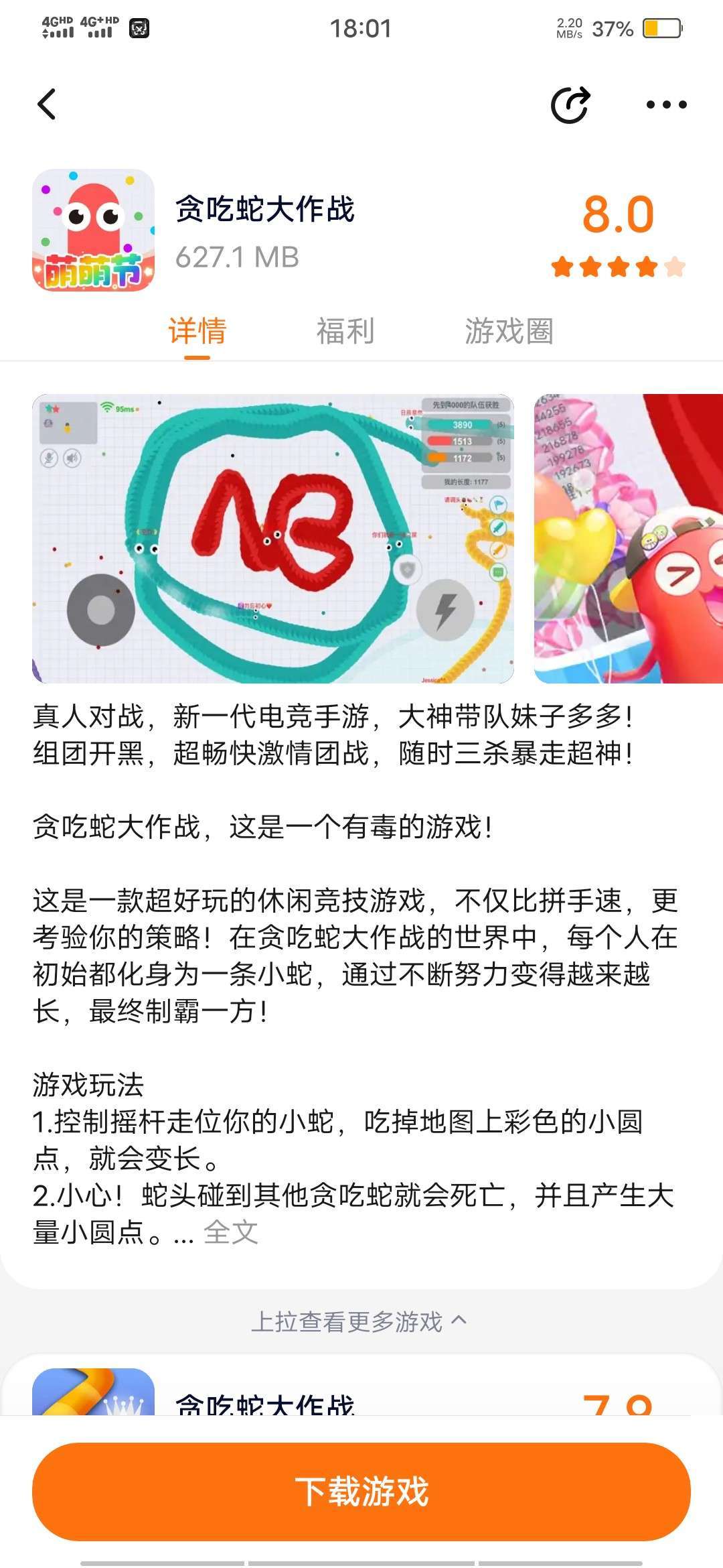 真人对战,新一代电竞手游,大神带队妹子多多! 组团开黑,超畅快激情团战,随时三杀暴走超神! 贪吃蛇大作战,这是一个有毒的游戏! 这是一款超好玩的休闲竞技游戏,不仅比拼手速,更考验你的策略!在贪吃蛇大作战的世界中,每个人在初始都化身为一条小蛇,通过不断努力变得越来越长,最终制霸一方! 游戏玩法 1.控制摇杆走位你的小蛇,吃掉地图上彩色的小圆点,就会变长。 2.小心!蛇头碰到其他贪吃蛇就会死亡,并且产生大量小圆点。 3.长按加速键,用巧妙的走位让蛇身被别人撞上,就可以吃掉尸体迅速变长。 4.无尽模式or限时模式or团战模式,和小伙伴们比比谁更长吧! 游戏特色 【以小搏大,战局随时都会逆袭】 你长你厉害,我短我灵活!大蛇不再有统治性的地位,小蛇们更灵活,战局随时都有可能逆转! 【简单有趣,老少皆宜的全民游戏】 不管是什么年龄、什么性别、什么职业,只要简单的在屏幕上戳戳戳,就能在贪吃蛇大作战找到满满的乐趣! 【这个游戏有毒,根本停不下来】 超Q超萌画风,一局一局像中毒了一样,根本停不下来,哈哈哈哈哈! 如果你喜欢贪吃蛇大作战,欢迎随时给我们留下宝贵的意见,推荐给好友一起来玩哦~