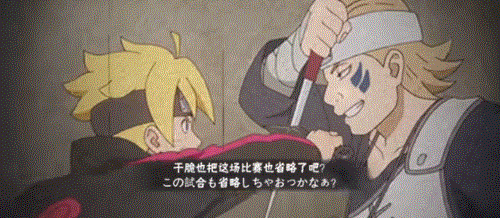 尤鲁伊上场前还是一只骄傲的小孔雀,他希望速战速决,连说话都要省略一半。独特的泡泡忍术让他一时间占据了上风,可是没过几招就被博人压在身下,狼狈不堪。然而在中忍考试使用科学忍具是作弊行为,学员们可不要向博人学习哦!