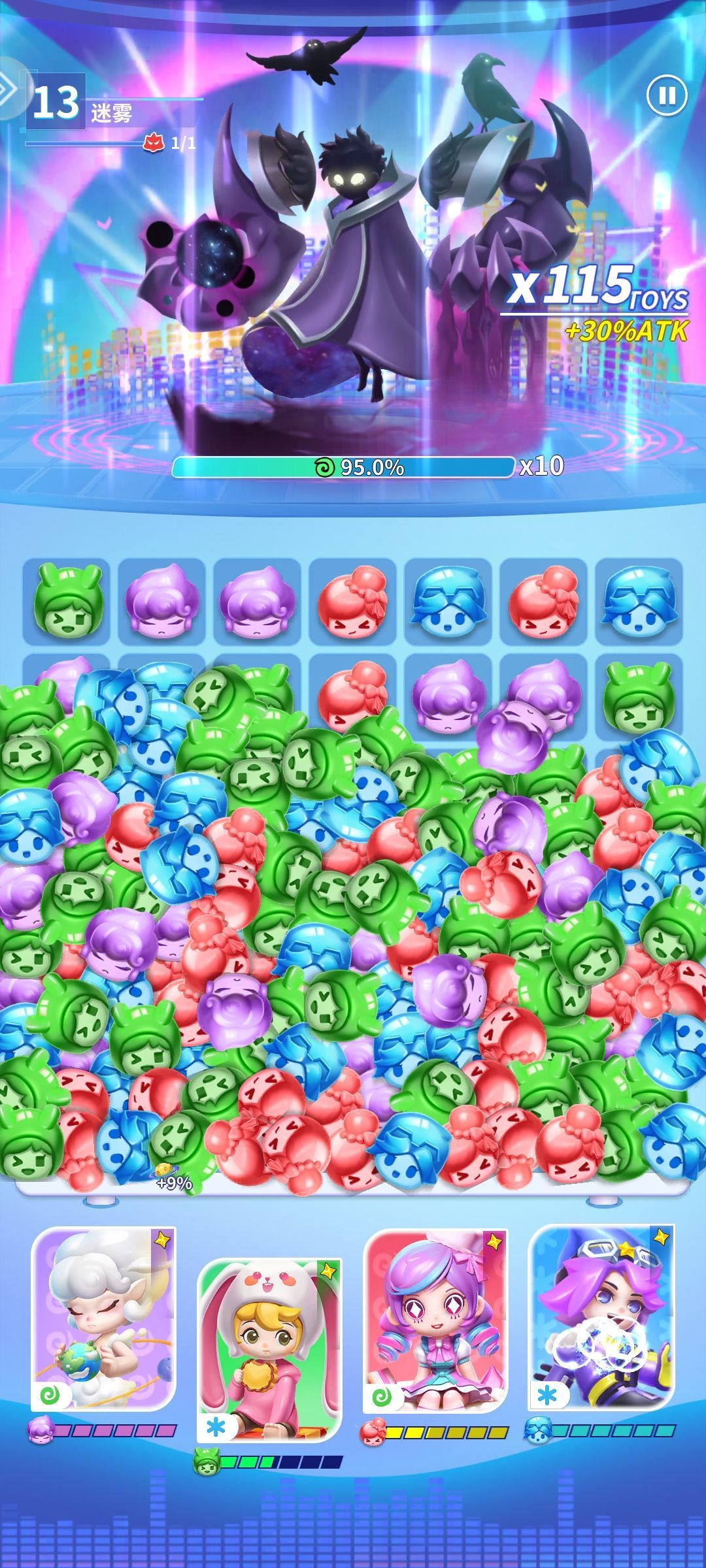 游戏看着像三消,其实也不那么三消,除了传承传统三消的游戏设定之外,玩偶技能更是重要招数,利用技能机制改变棋盘布局,单回合消除的棋子越多,对BOSS产生的伤害越高,不同的玩偶机制可以build各类流派。