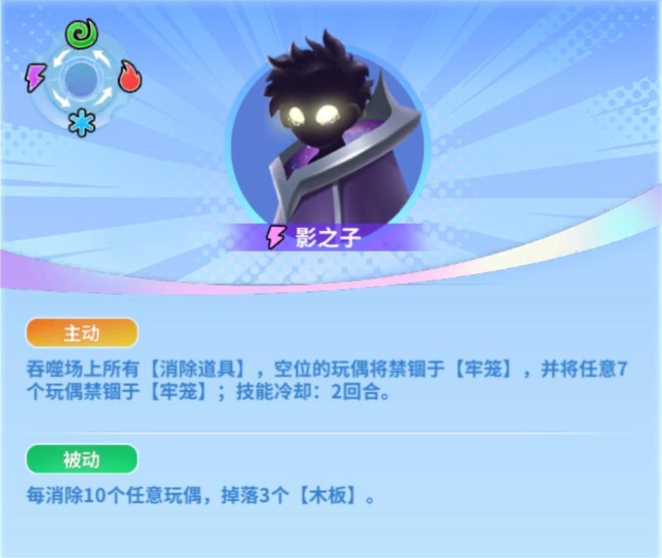 影之子的主动技能是吞噬消除道具,将玩偶禁锢于牢笼。