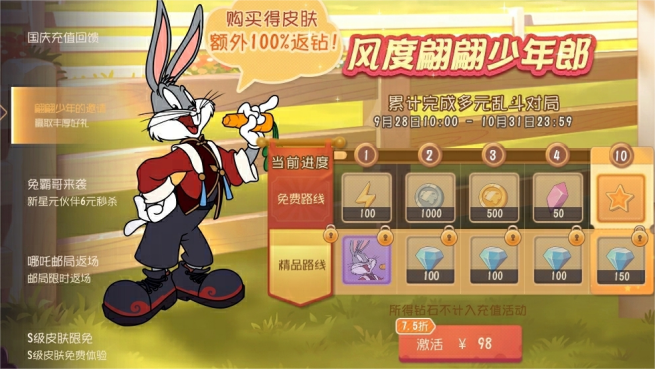 小伙伴们花费98元解锁精品路线,完成以上对应任务后,便能享受到100%返还钻石的福利,而且还能免费获得A级皮肤兔八哥·文质彬彬哦。