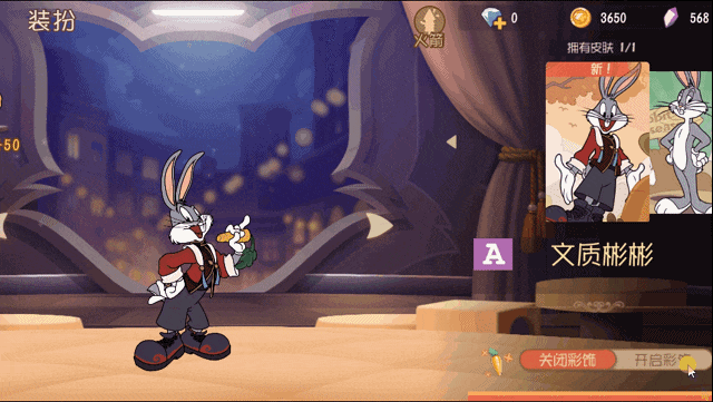 全新A级皮肤——兔八哥·文质彬彬已上线游戏中啦!平日里帅帅酷酷的兔八哥这次穿的有点与众不同哦,似乎尝试了一种全新的风格呢~让我们一起来欣赏下他的新装吧!