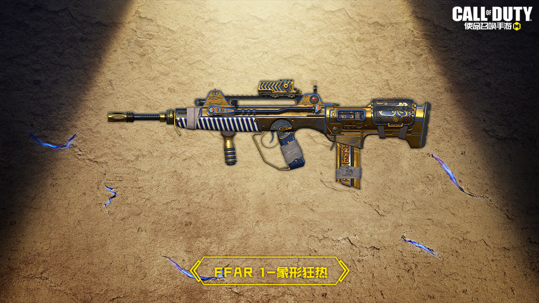 FFAR 1-象形狂热全镀金的枪身彰显了身份和权利。细节处用来防滑的纹路布满了时代的痕迹,尘封千年,这把武器将再次焕发光彩,成为战场的高光!