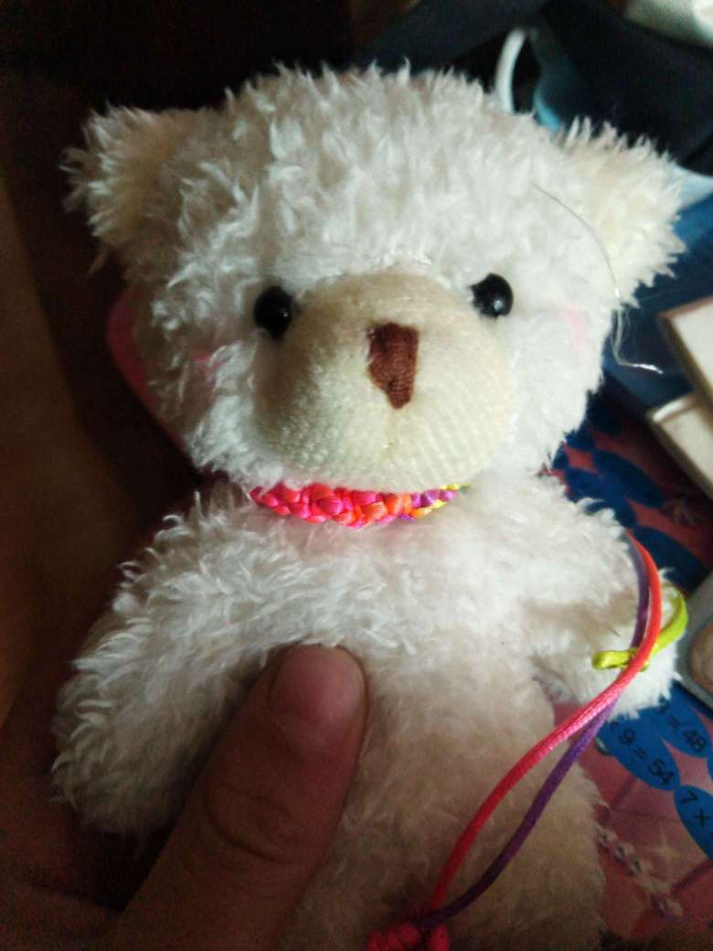 大家快看,这是我书包上送的小熊熊,这个小熊,我还给他围了一个手链,这个小熊可爱极了,还配了一个小萝卜