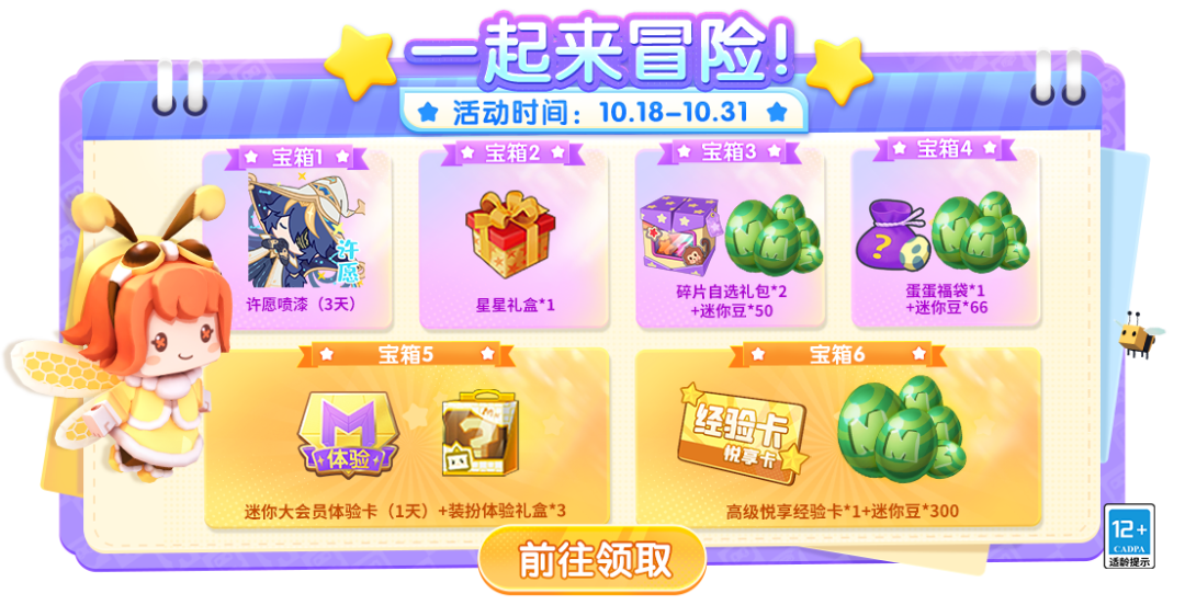 10.18-10.31期间,完成对应任务、积攒冒险值,开启对应宝箱,可以获得星星礼盒、碎片自选礼包、迷你豆(共*416)、大会员体验卡、高级悦享经验卡等丰厚奖励!