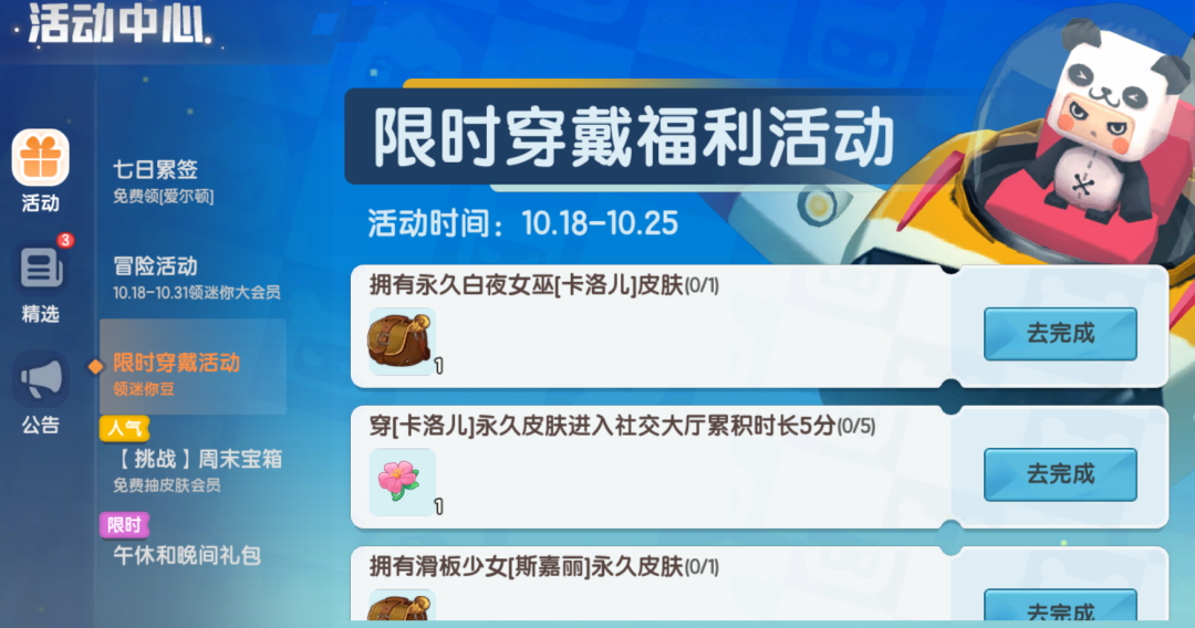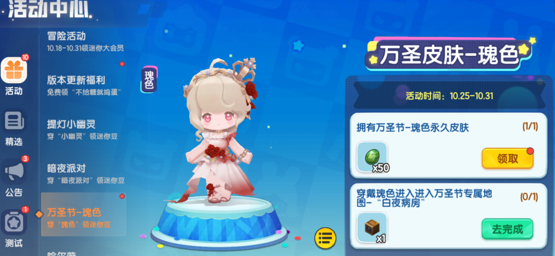 10.18-10.25活动期间,拥有或穿戴白夜女巫「卡洛儿」、滑板少女「斯嘉丽」,可获得迷你豆、礼物等福利!