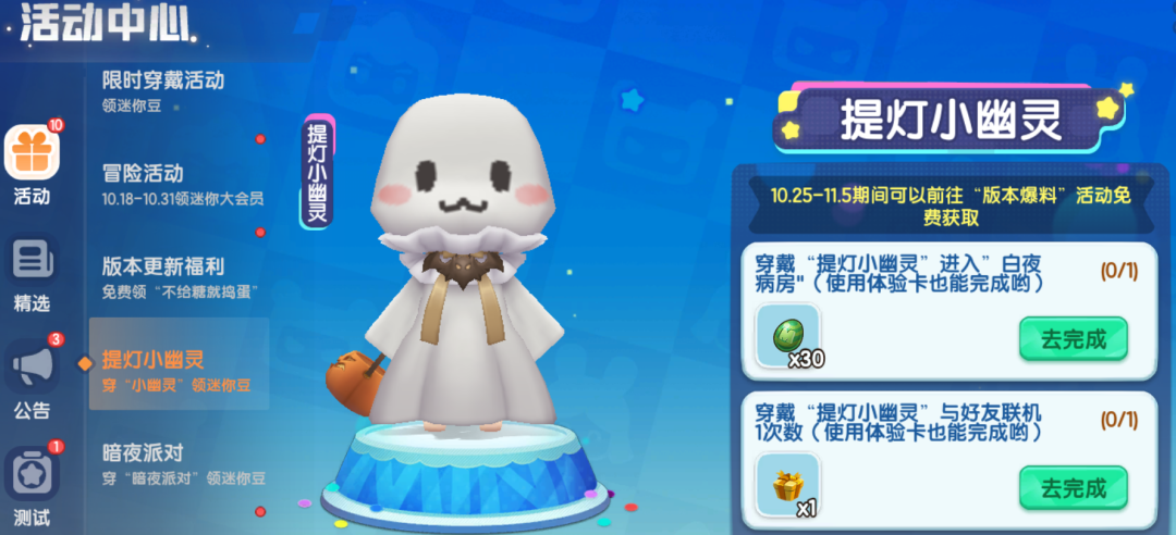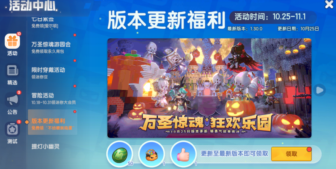 更新版本领专属福利——迷你豆、定制装扮「不给糖就捣蛋」、礼物「赞」~