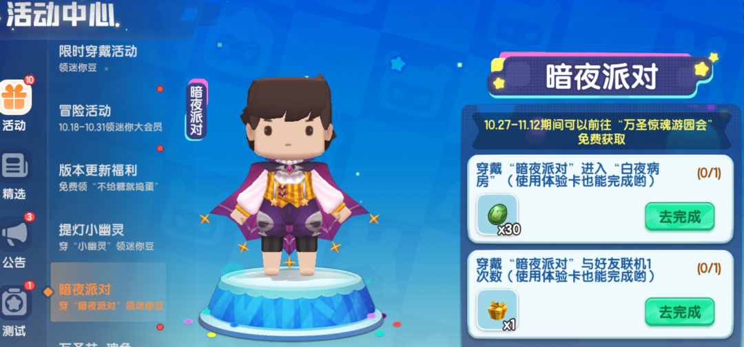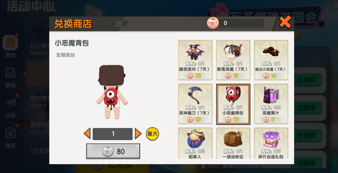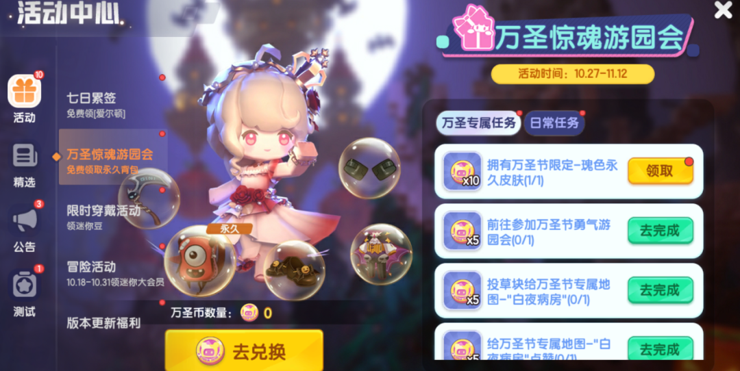 参与万圣节游园会,完成【万圣专属任务】和【日常任务】,可获得「万圣币」。「万圣币」可在兑换商店兑换迷你豆、小恶魔背包(永久)、「暗夜派对」(7天)、「断角恶魔」(7天)、「死神镰刀」(7天)、碎片自选礼包等丰富奖励;