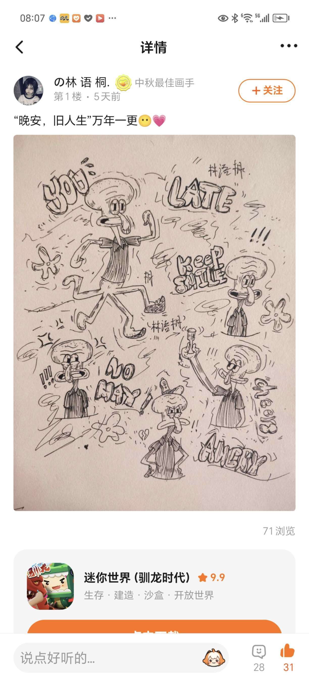 咱绘画大佬:林语桐就是那种万年一更,一更惊人!这岂不是把章鱼哥的性子明明白白的刻画出来了?不能说像,只能说,一模一样!