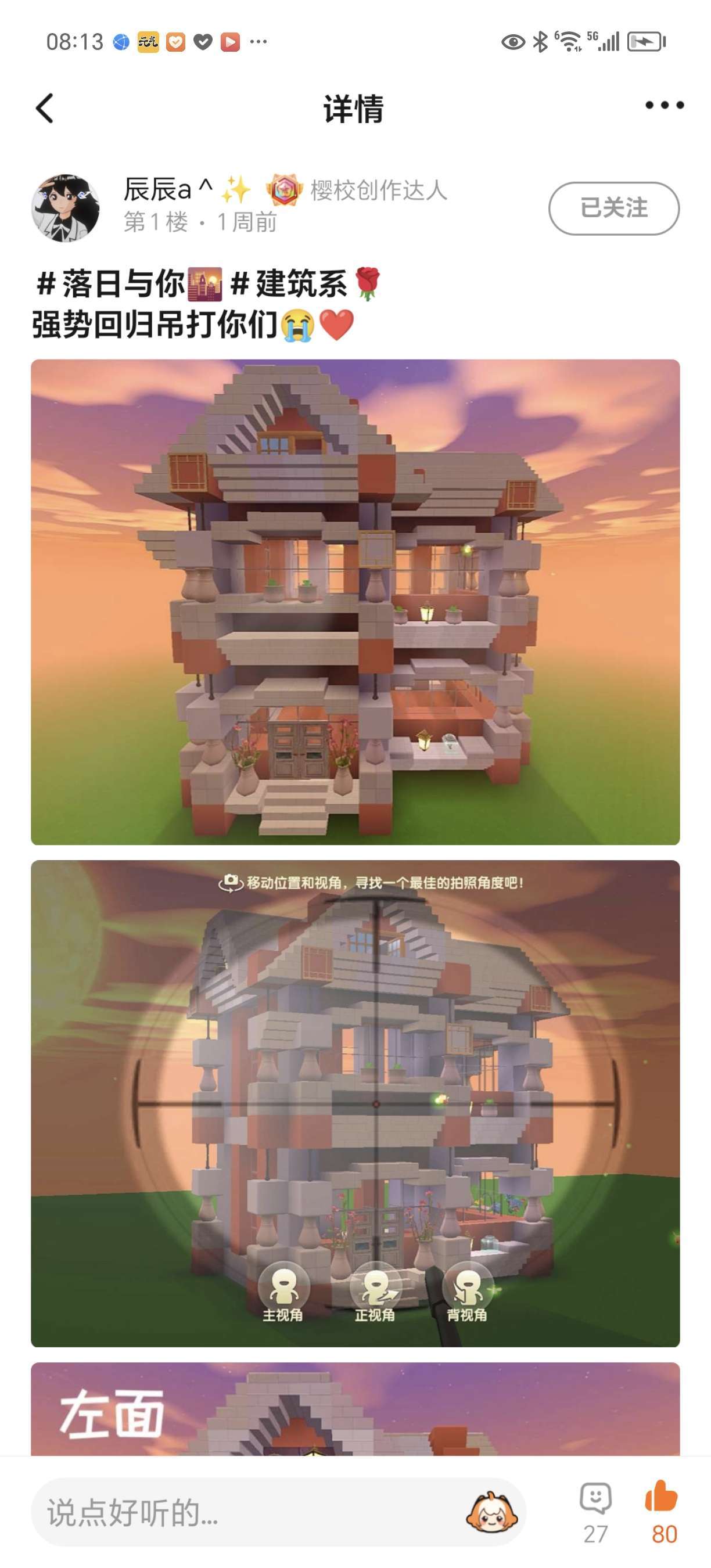 咱们的建筑大佬辰辰强势回归!带来那以往不凡的作品!这建筑阿柒那是一个喜欢啊!这配色和景色相结合,8真是优秀得不要命啦!?