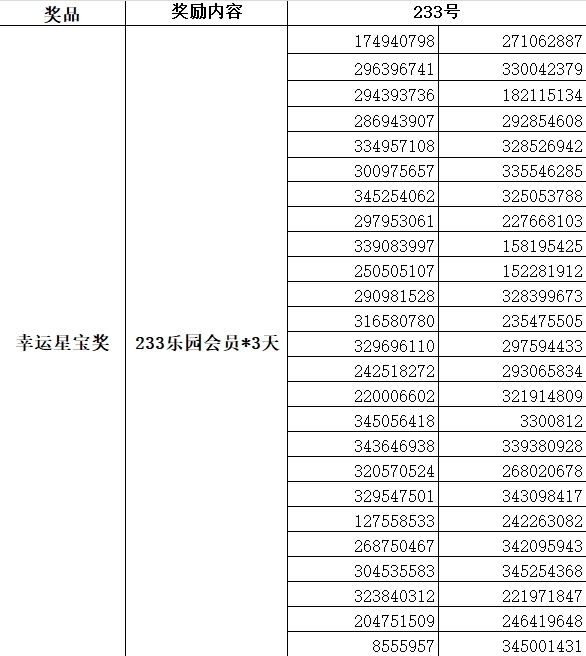 4)幸运星宝奖:抽取50位幸运星宝送出【233乐园会员*3天】