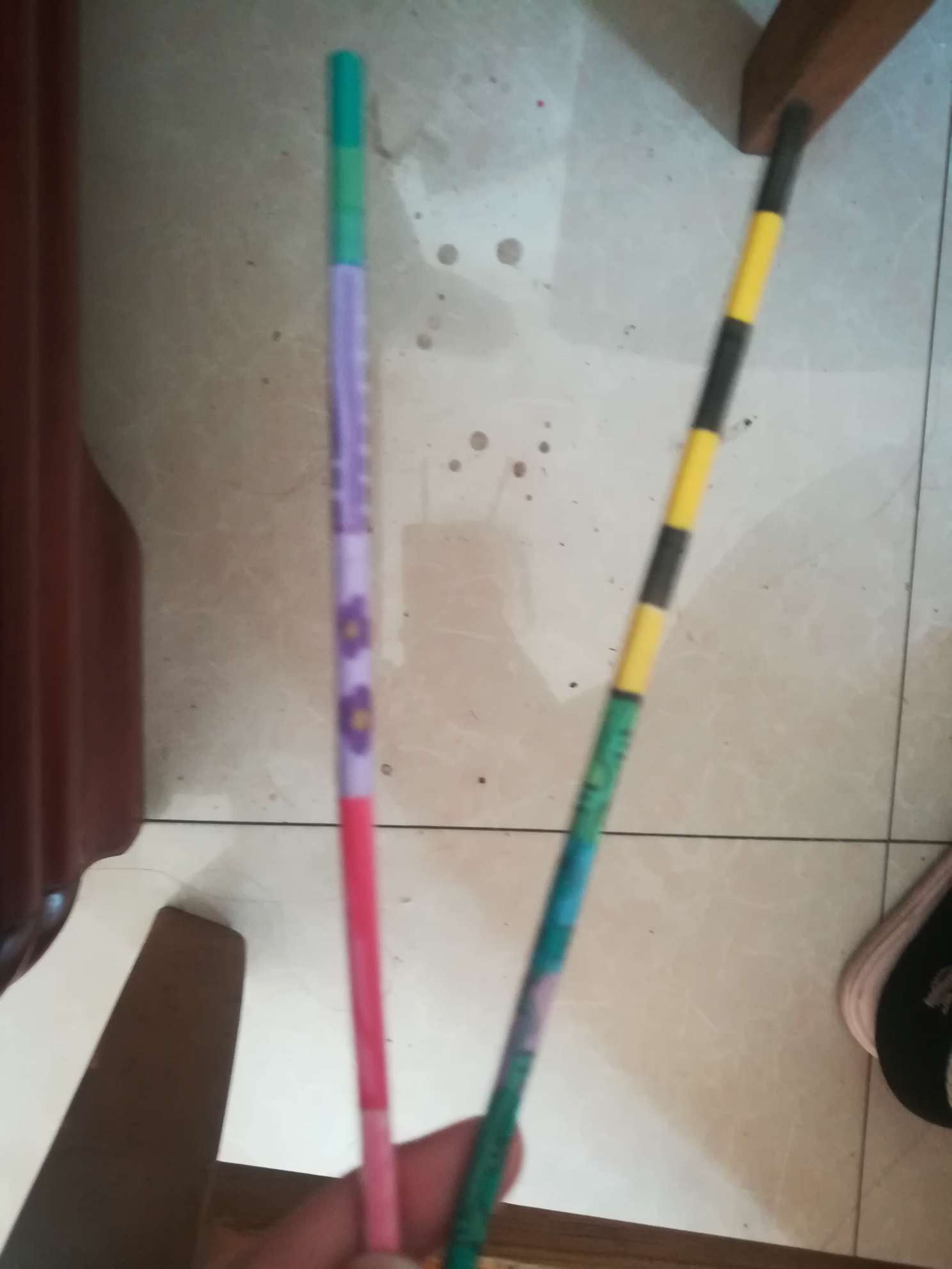 我画了一个大罗神通棍,左边那个是我闺蜜画的右边那个是我画的,我画的那个上面那个黄黑相间的是我认真画的,下面那个是我随便画的,可能拍的不太清楚。